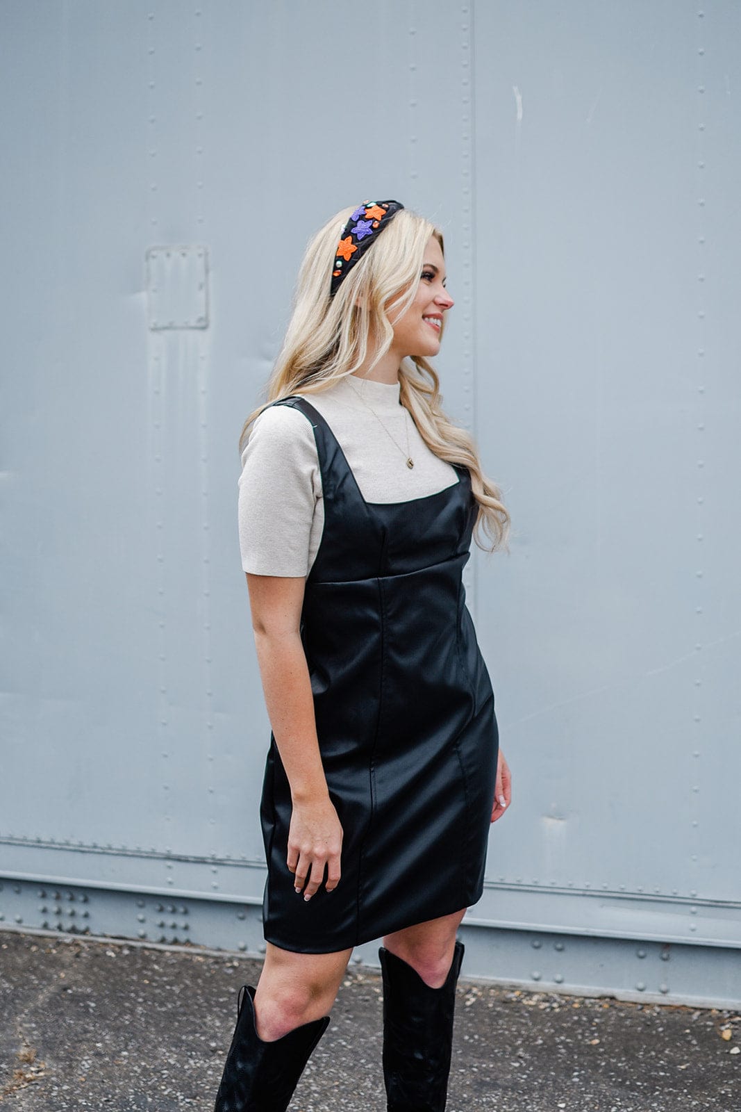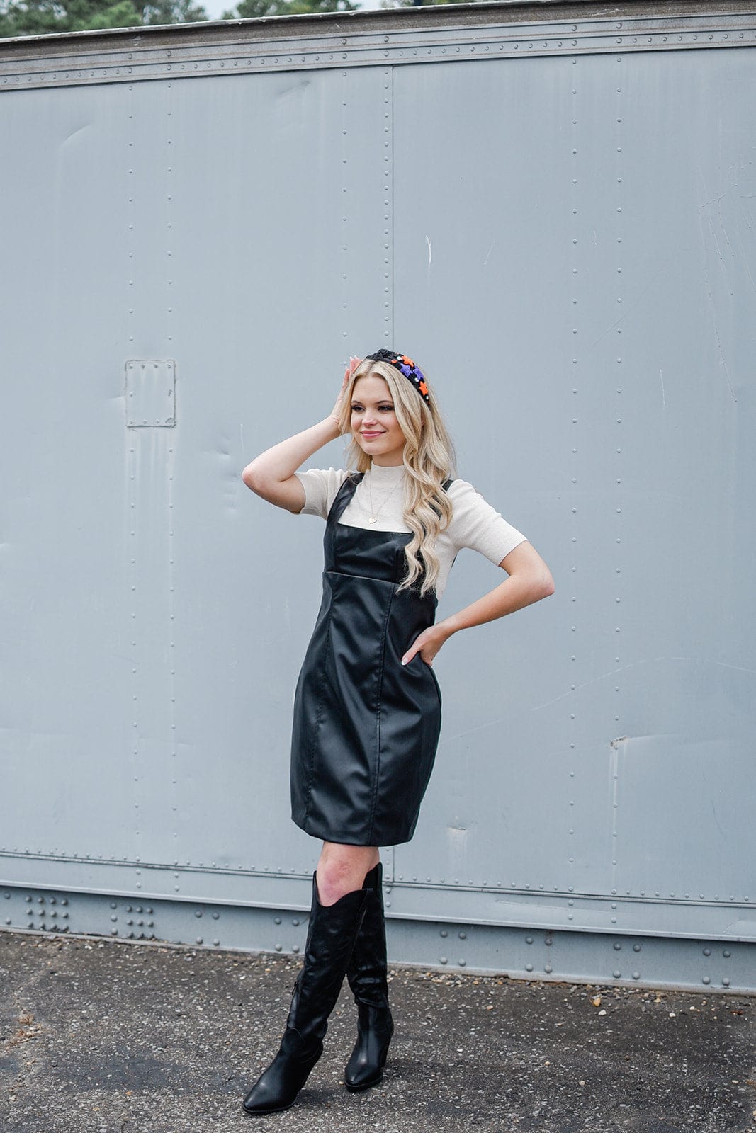 The Black Vegan Leather Mini Dress has a sleek and glossy finish that looks and feels like genuine leather. giving it a luxurious and edgy appeal. The square neckline and fitted bodice accentuates your curves.  Tailored seams at the front and back create an hourglass silhouette.