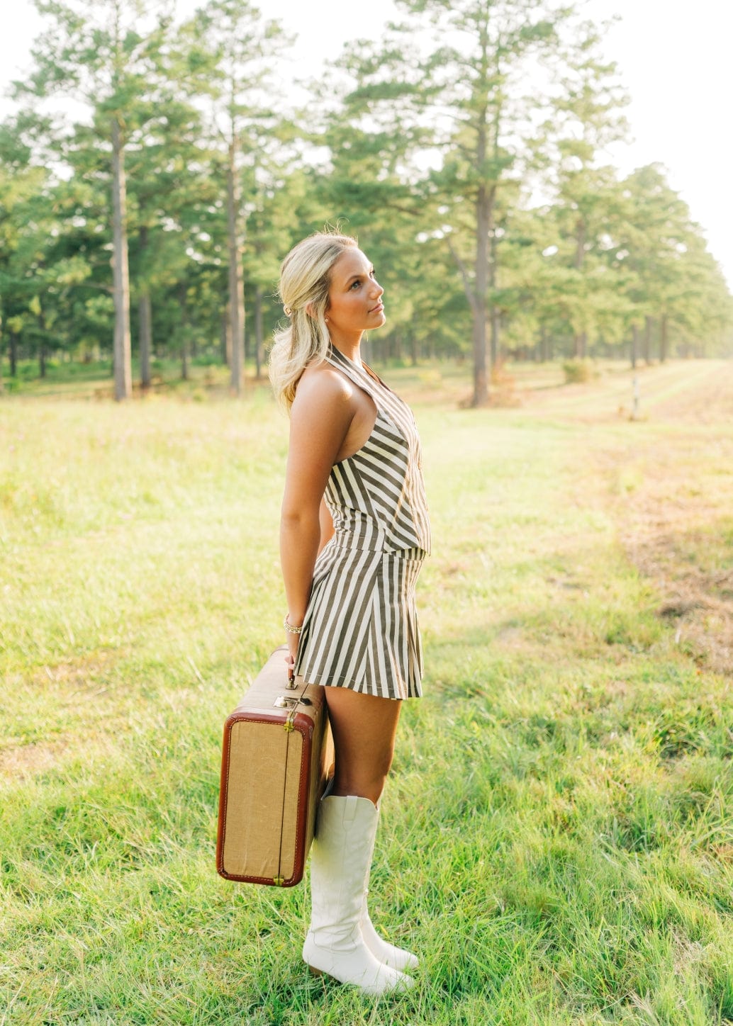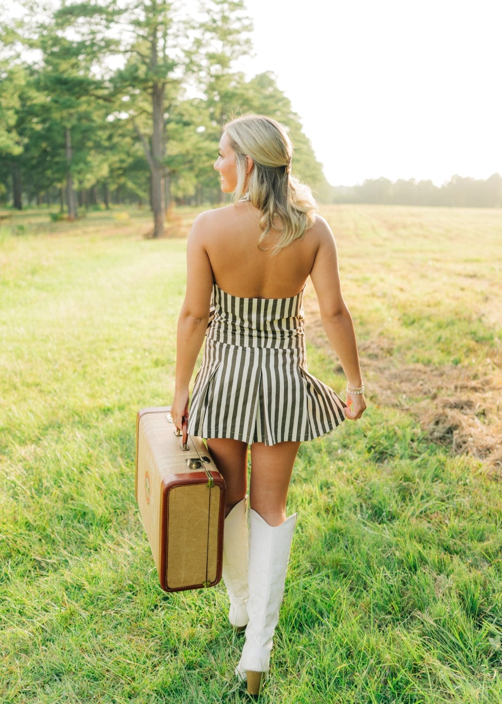Elevate your summer style with our Brown Striped Pleated Vest Mini Dress! The halter neck and v-neckline create a flattering silhouette. while the button front and pleated design add a touch of sophistication. Perfect for any occasion. this mini dress will keep you looking chic and comfortable.