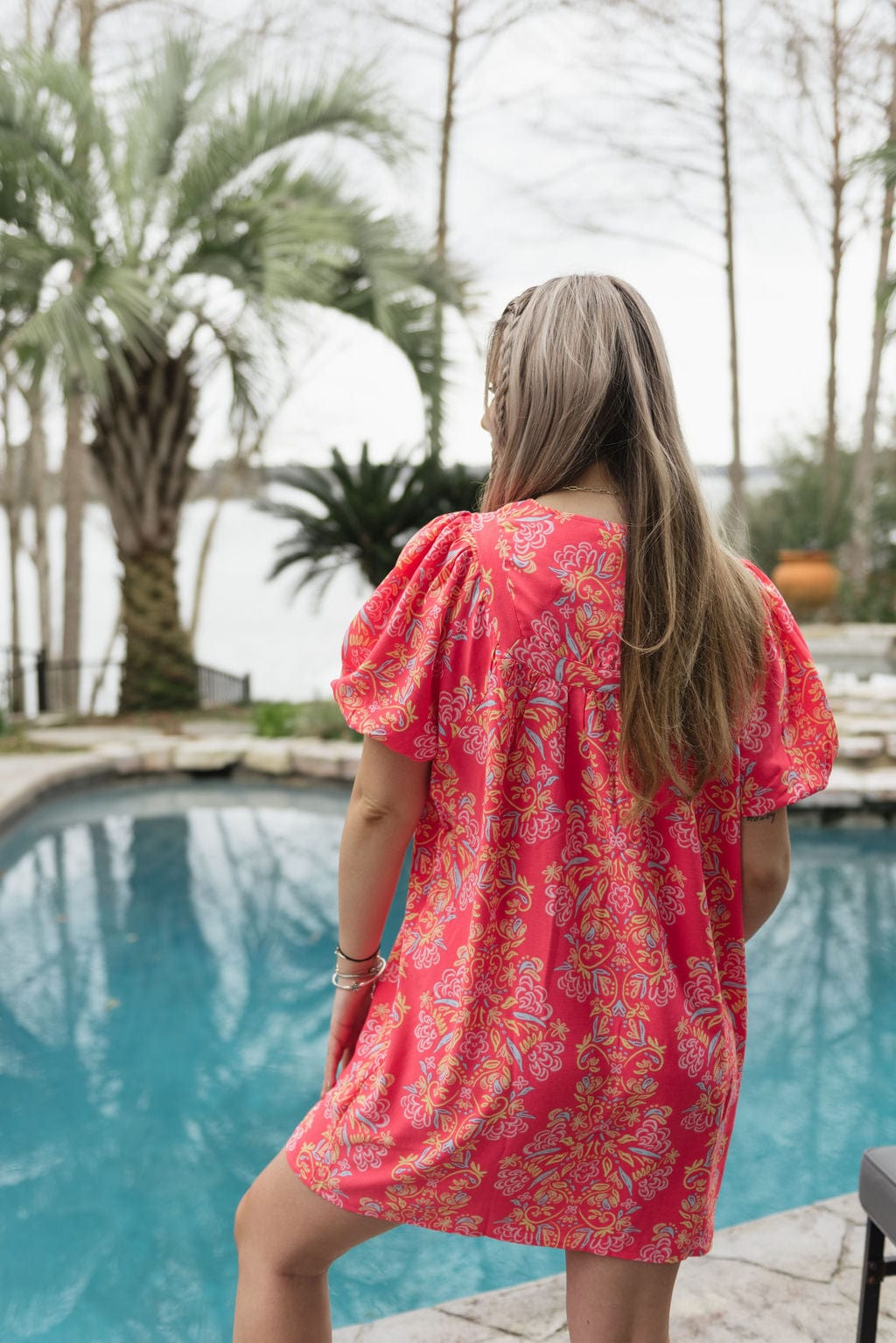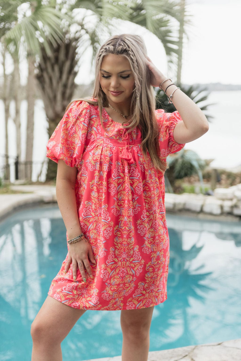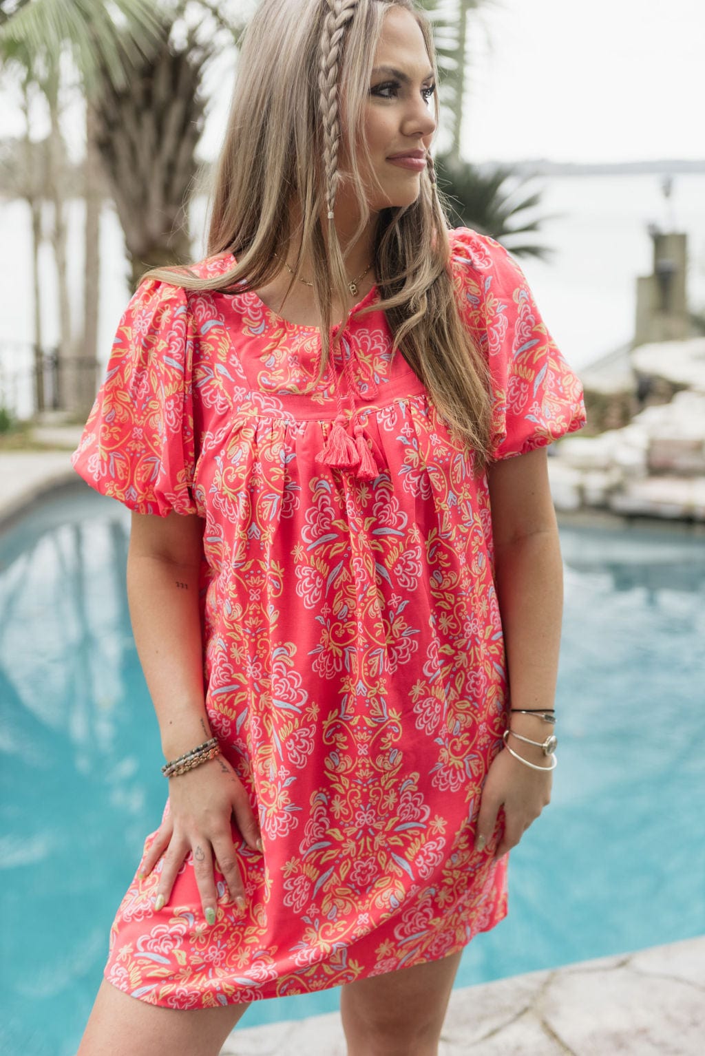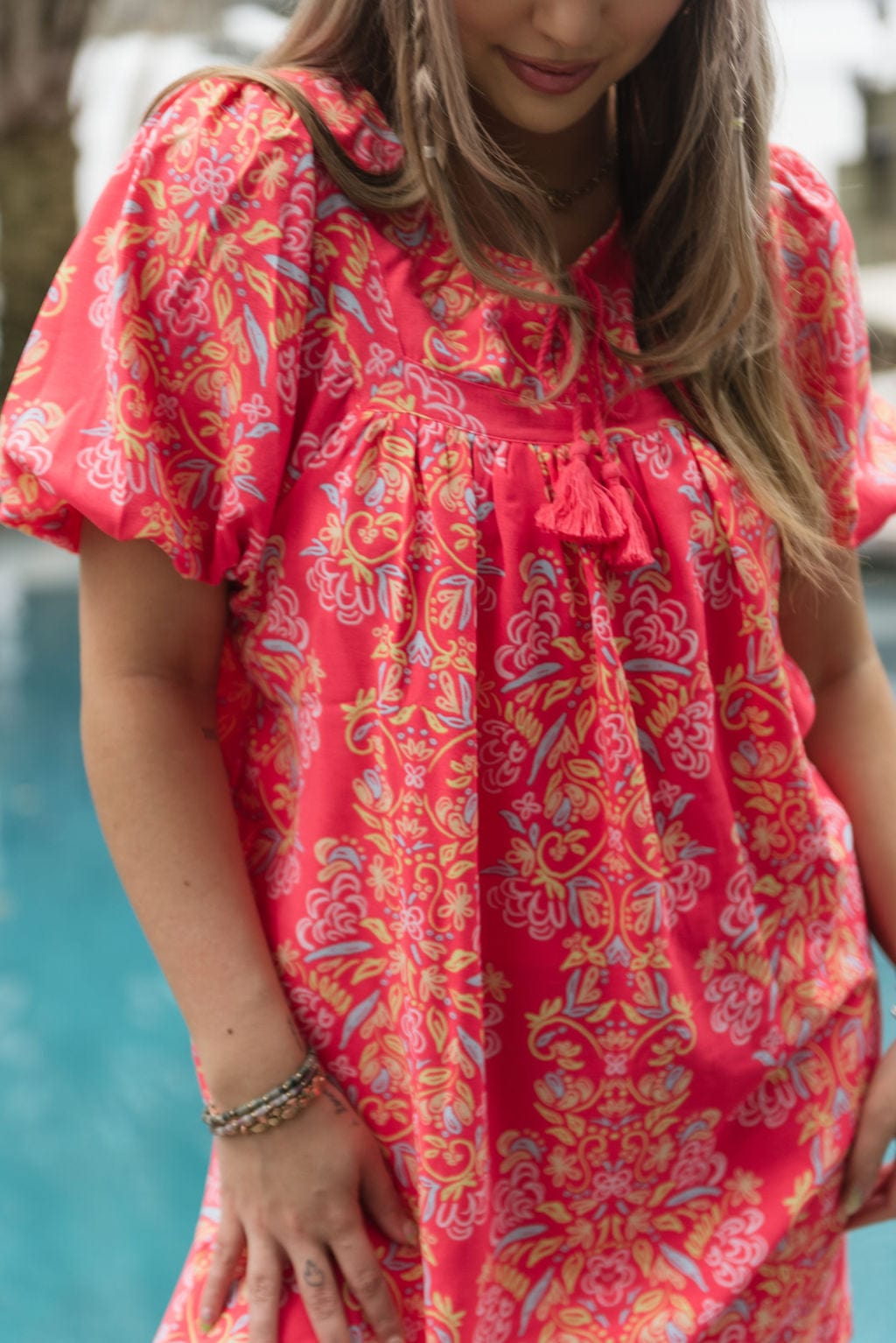 A captivating blend of style and charm that’s sure to turn heads. The Coral Penny Busy Bee Dress features a yoke neckline adorned with intricate trim details. creating an elegant focal point. Adding a touch of playful flair. tassels grace this piece. while the short puff sleeves complete the look with a hint of romance. Elevate your wardrobe with the Penny Dress. a perfect embodiment of timeless elegance and fashion-forward appeal.
