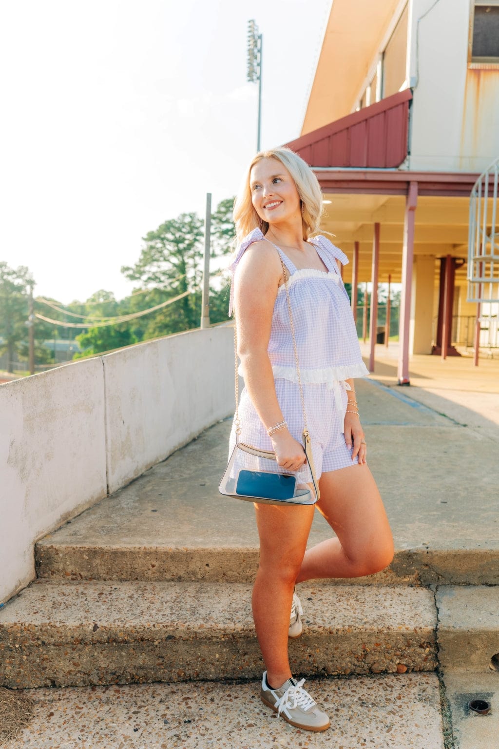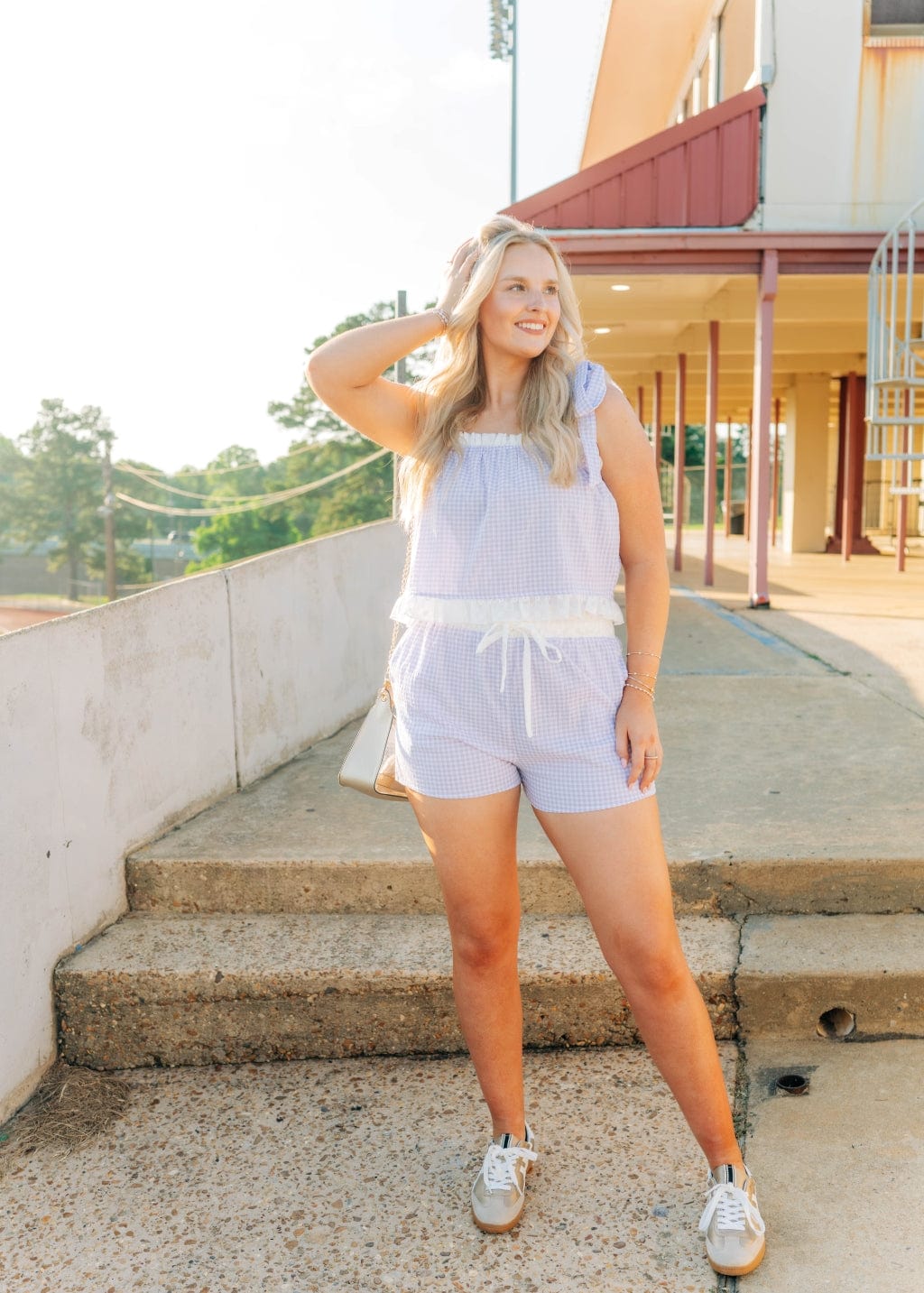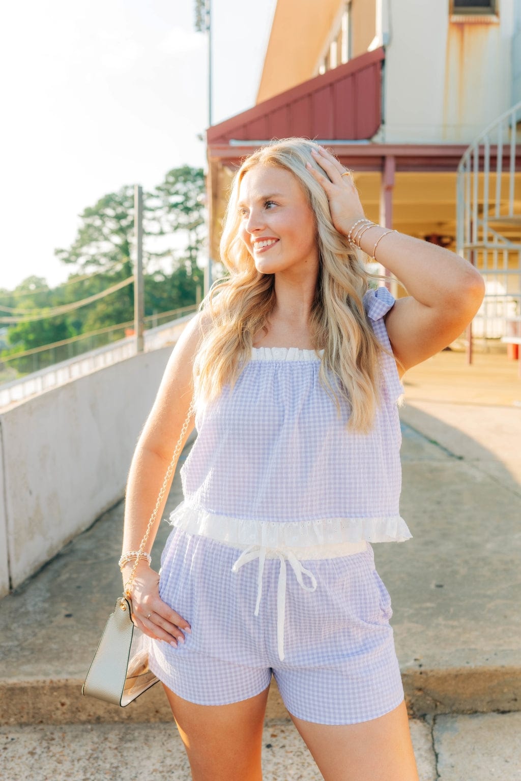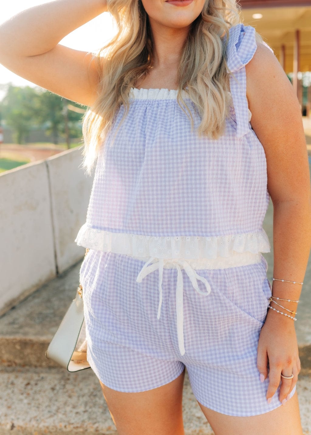 Experience ultimate comfort and style in our Purple Gingham Ruffle Trim Short Set. Featuring eye-catching gingham and delicate eyelet lace detail. this set is perfect for a casual day out. The ruffle trim. shoulder tie. and square neckline add a touch of femininity. while the stretchy. drawstring shorts provide a comfortable and flattering fit. Upgrade your wardrobe with this must-have set today!