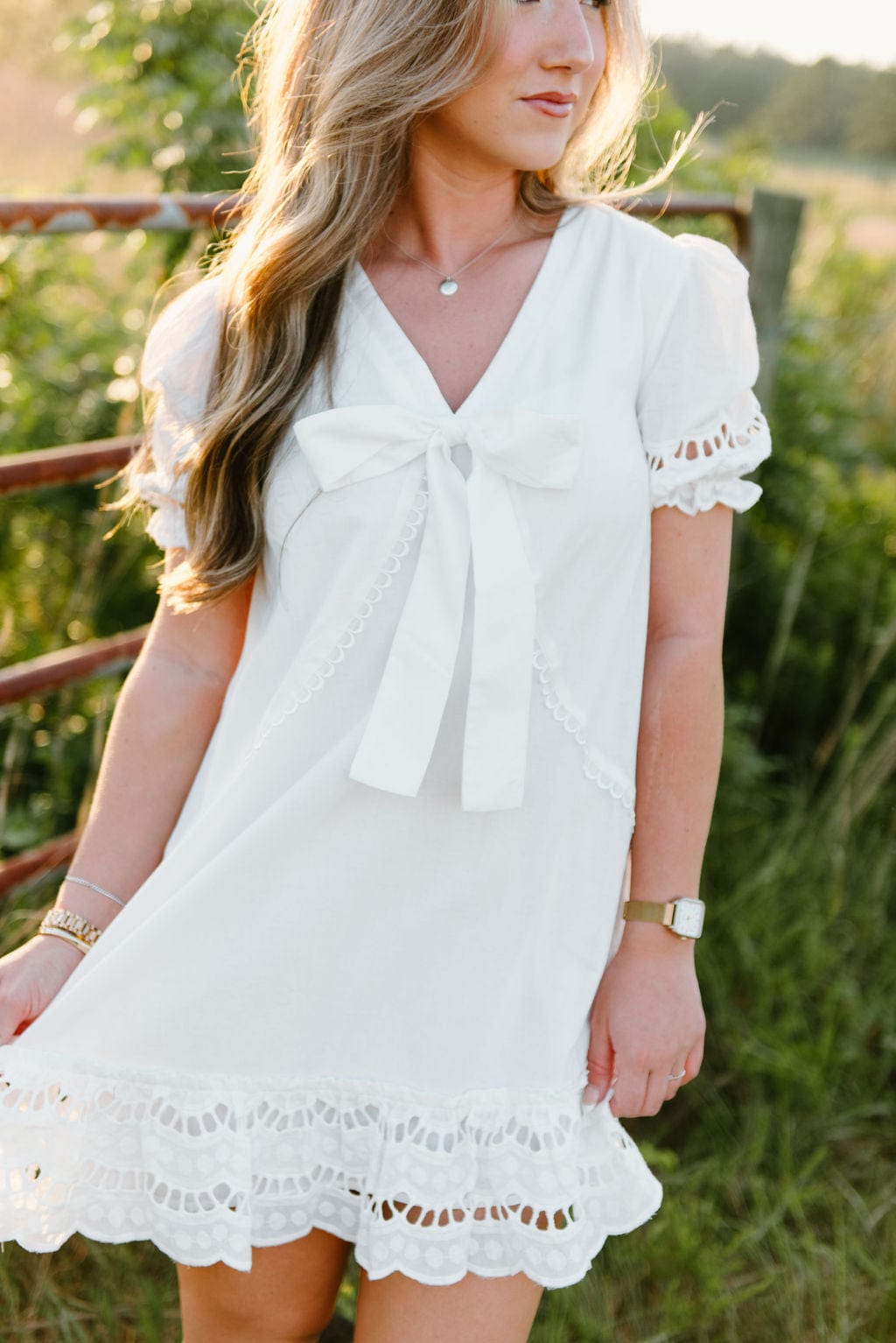 White Eyelet Lace Bow Front Dress