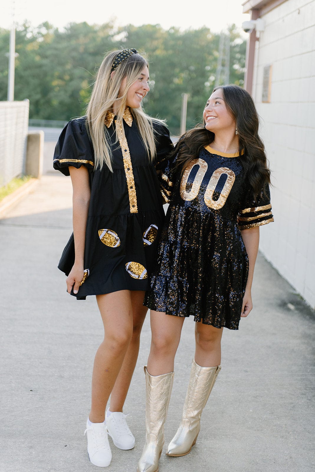 The Black & Gold Jersey Sequin Dress is a dazzling and spirited garment tailored for enthusiastic fans of the New Orleans Saints. This dress is a vibrant celebration of the Saints’ iconic black and gold color scheme. The black & gold sequins add a touch of glamour and excitement to the dress. making it a standout choice for game day festivities.