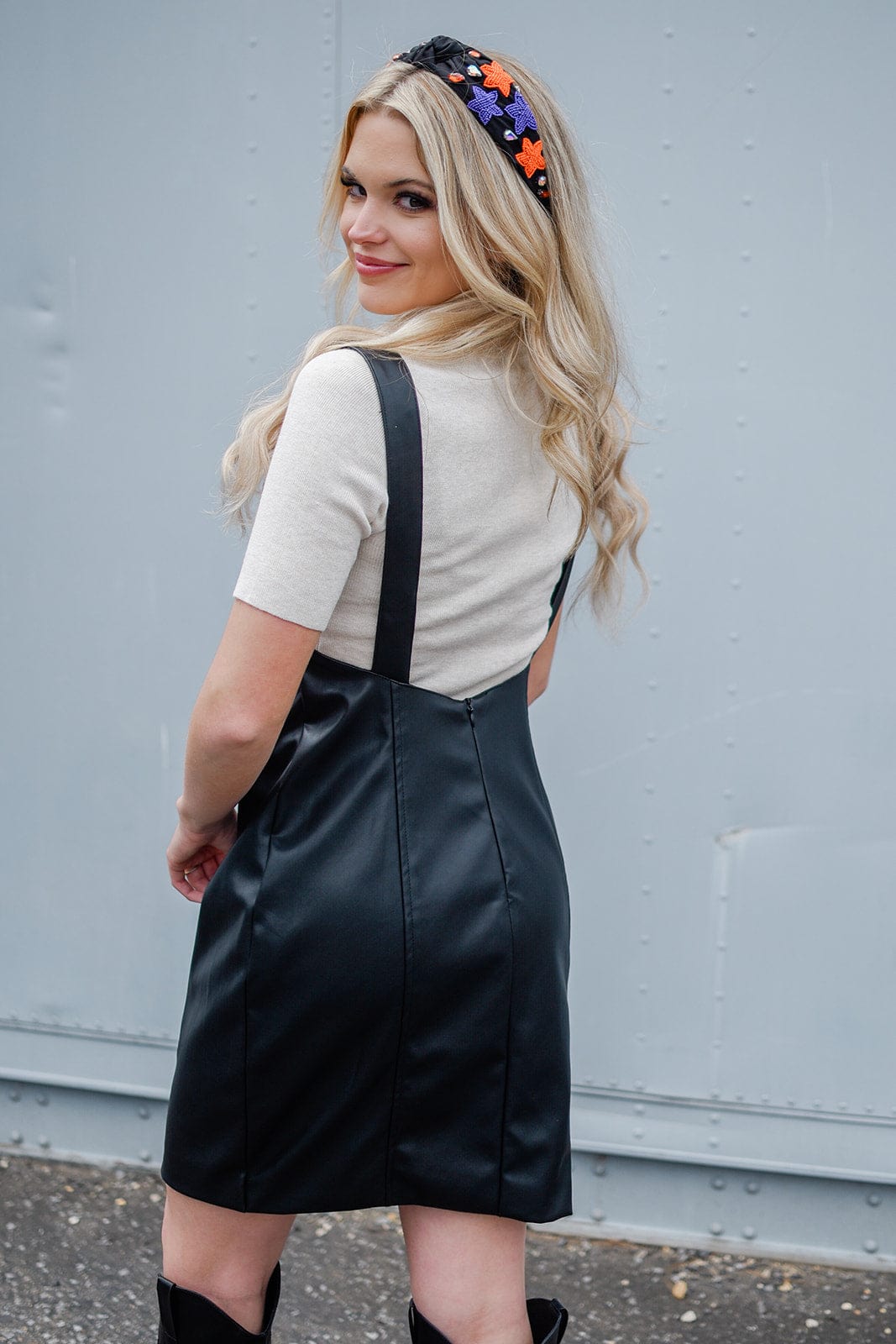 The Black Vegan Leather Mini Dress has a sleek and glossy finish that looks and feels like genuine leather. giving it a luxurious and edgy appeal. The square neckline and fitted bodice accentuates your curves.  Tailored seams at the front and back create an hourglass silhouette.