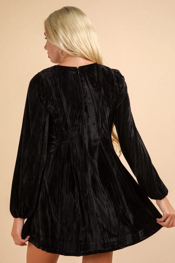Elevate your holiday wardrobe with our Black Velvet Mini Flare Dress. The rich black velvet fabric. v-neckline. and flowy silhouette create an alluring look while the stretchy material and long sleeves ensure comfort all night long. Make a statement at any event in this must-have mini dress!