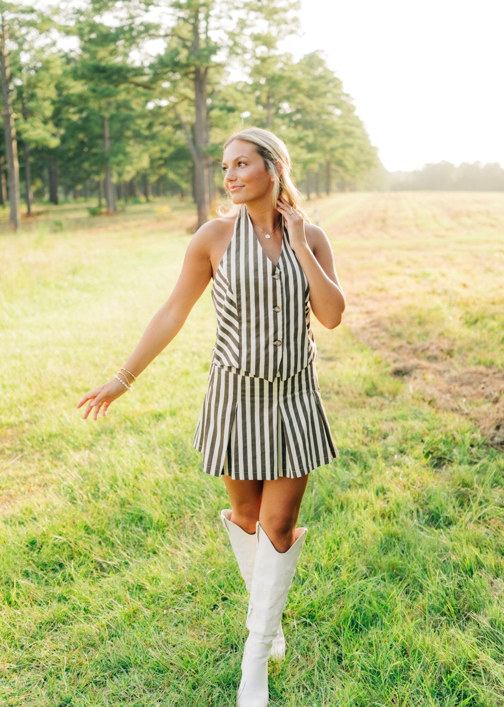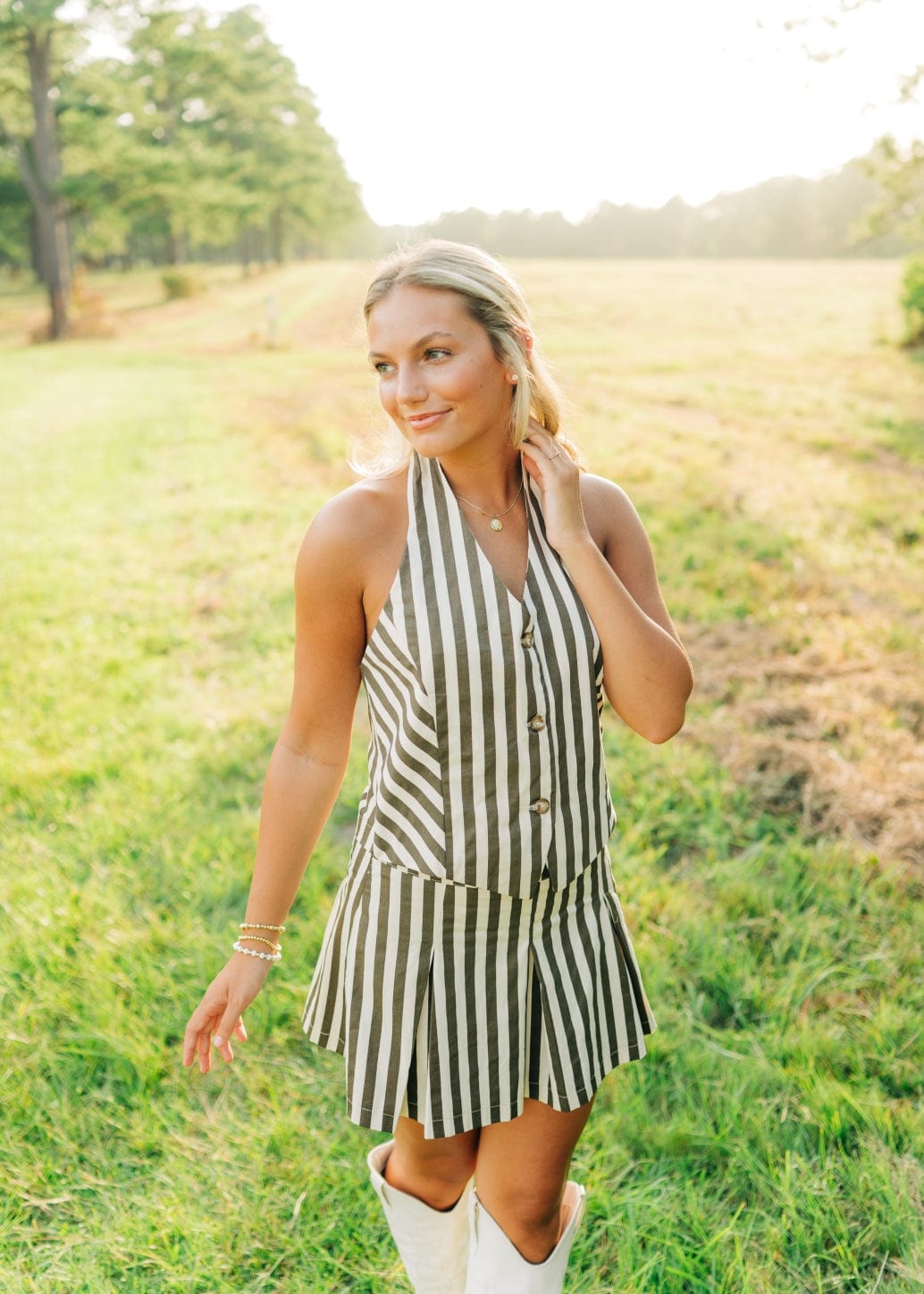 Elevate your summer style with our Brown Striped Pleated Vest Mini Dress! The halter neck and v-neckline create a flattering silhouette. while the button front and pleated design add a touch of sophistication. Perfect for any occasion. this mini dress will keep you looking chic and comfortable.