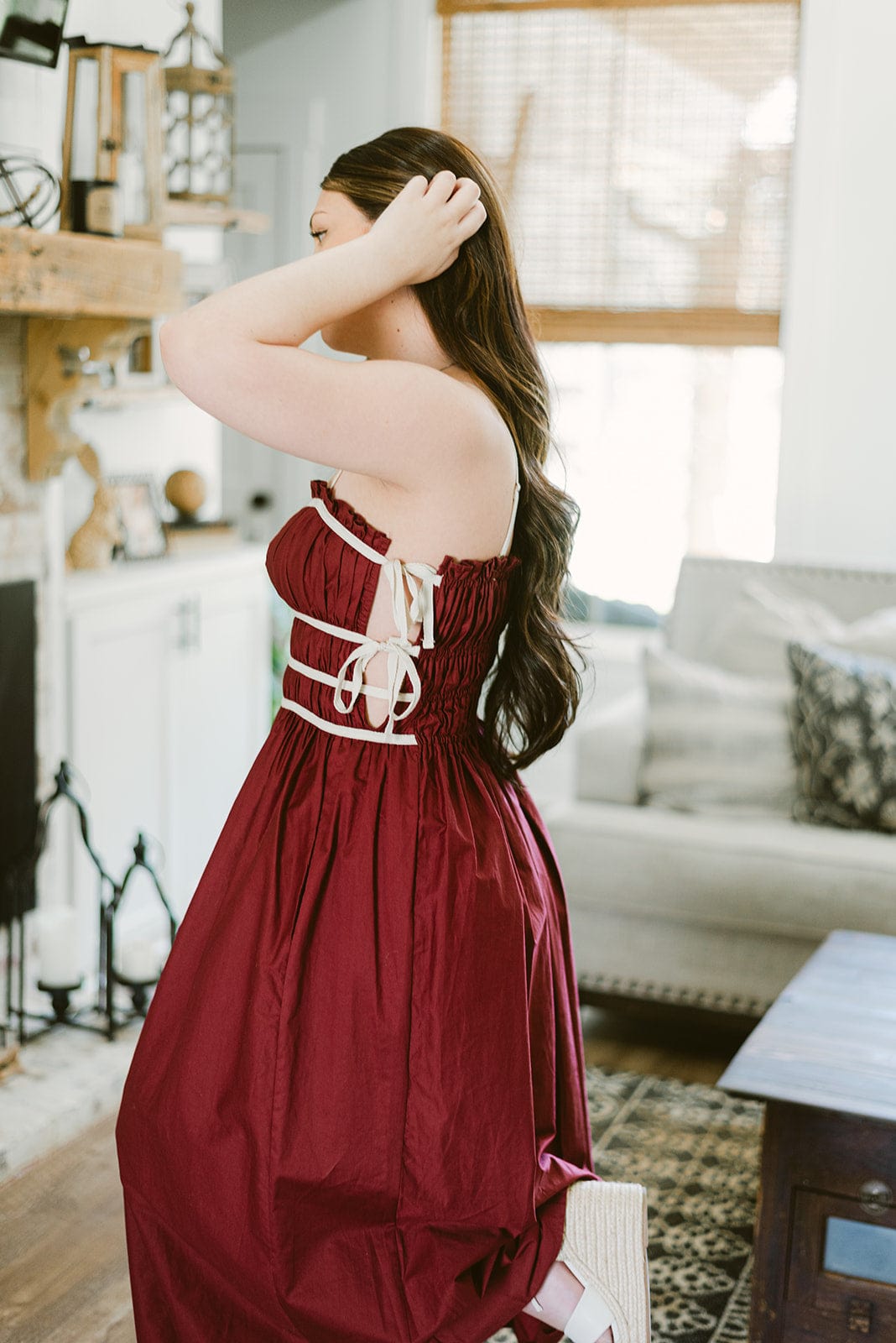 Fall in love with this stunning Burgundy Poplin Midi dress featuring adjustable spaghetti straps. a square neckline. and bow detail on both sides. Adjustable side cut outs make this dress the perfect combination of sophistication and comfort. The flowy fabric is perfect for any occasion. Make a statement wherever you go!