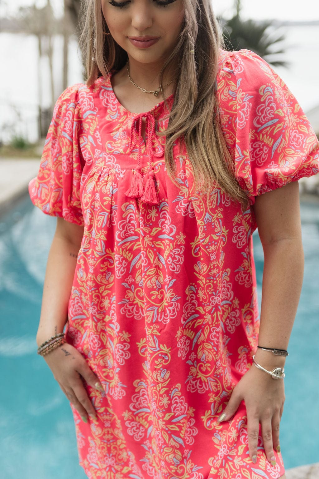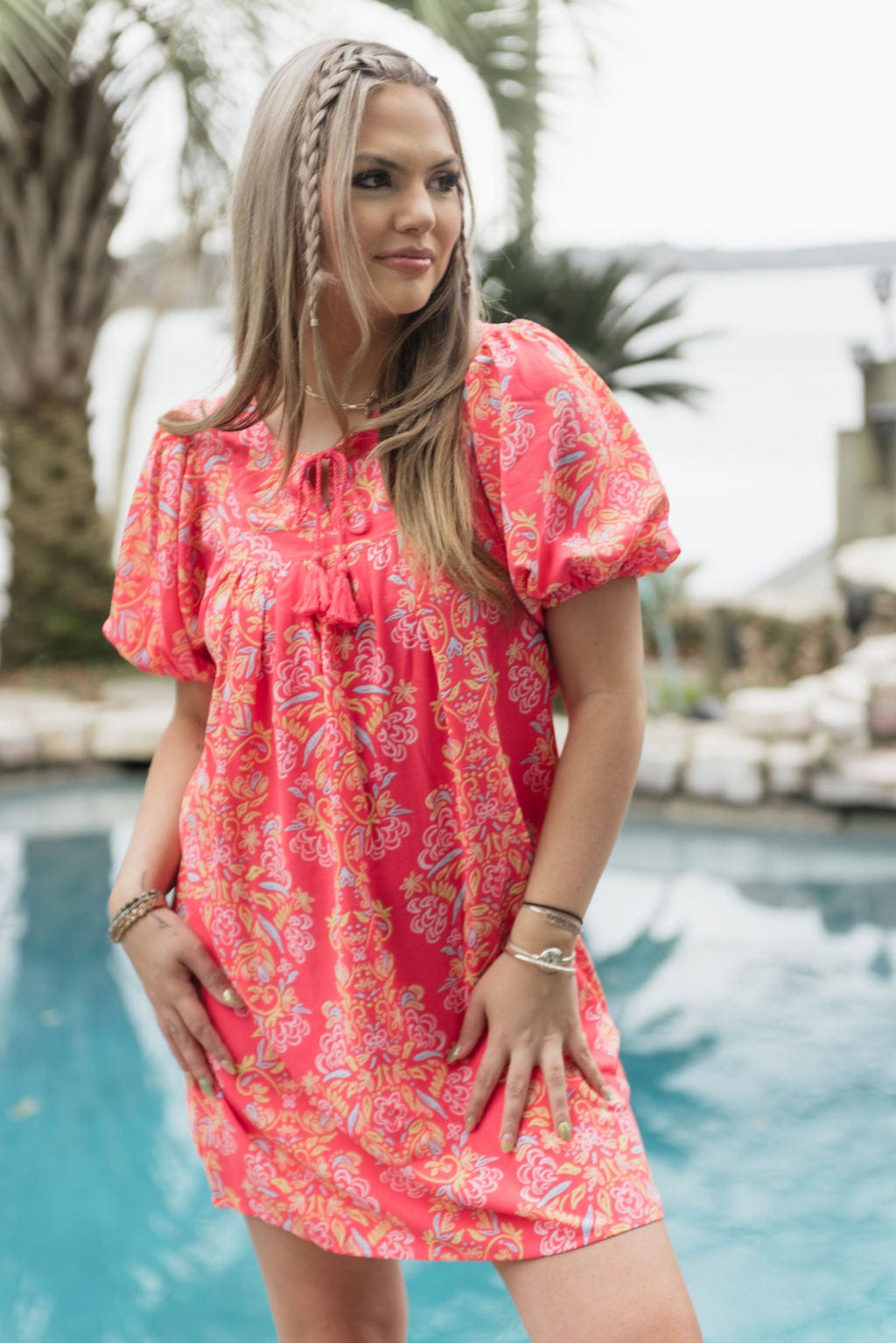 A captivating blend of style and charm that’s sure to turn heads. The Coral Penny Busy Bee Dress features a yoke neckline adorned with intricate trim details. creating an elegant focal point. Adding a touch of playful flair. tassels grace this piece. while the short puff sleeves complete the look with a hint of romance. Elevate your wardrobe with the Penny Dress. a perfect embodiment of timeless elegance and fashion-forward appeal.