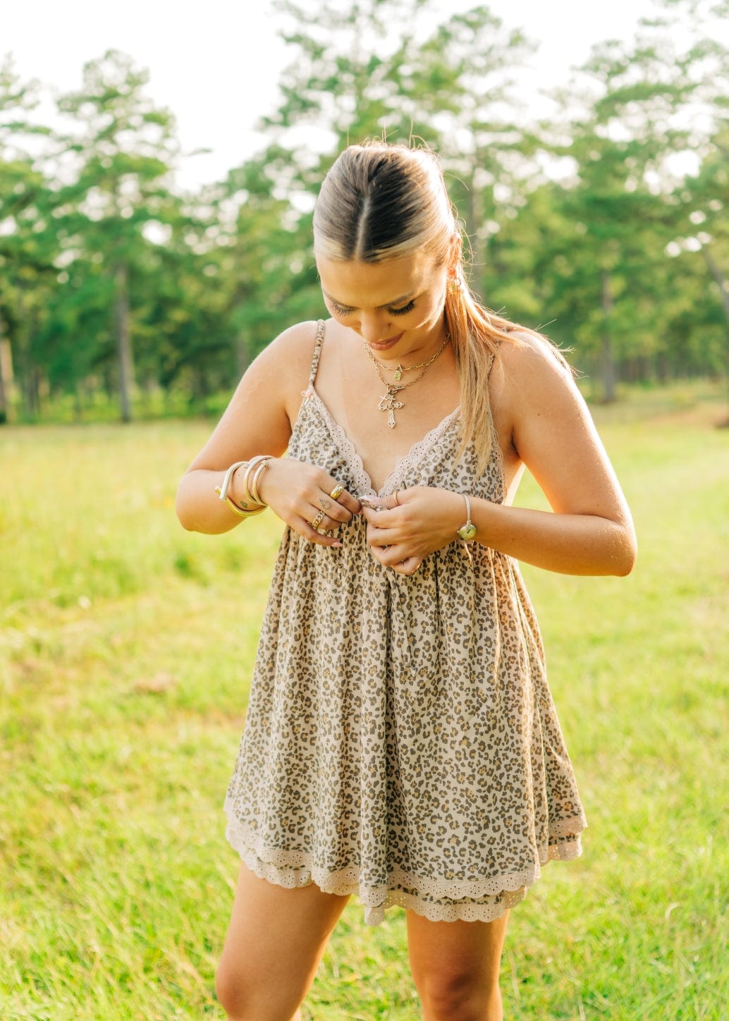 Introducing our Leopard Lace Trim Mini Dress! This dress combines the fierce style of leopard print with a delicate lace trim and a flattering sweetheart neckline. With adjustable spaghetti straps and a flowy design. it’s perfect for any occasion. Stand out and make a statement in this mini dress.