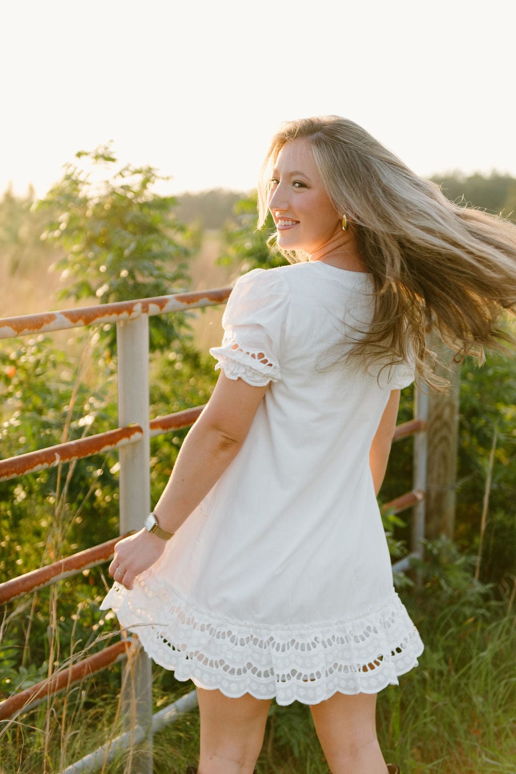 Get ready to turn heads with our White Eyelet Lace Bow Front Dress! This stunning dress features a flattering v-neckline. delicate short puff sleeves. and intricate eyelet lace details. The tie front and ruffle hem add a feminine touch. making it perfect for any Spring occasion. Embrace your classy and elegant side with this must-have dress.